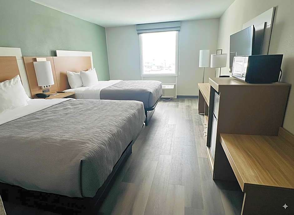 This quadruple room is air-conditioned and has a flat-screen TV with cable channels, a tea and coffee maker, a wardrobe and tumble dryer. The unit has 2 beds.